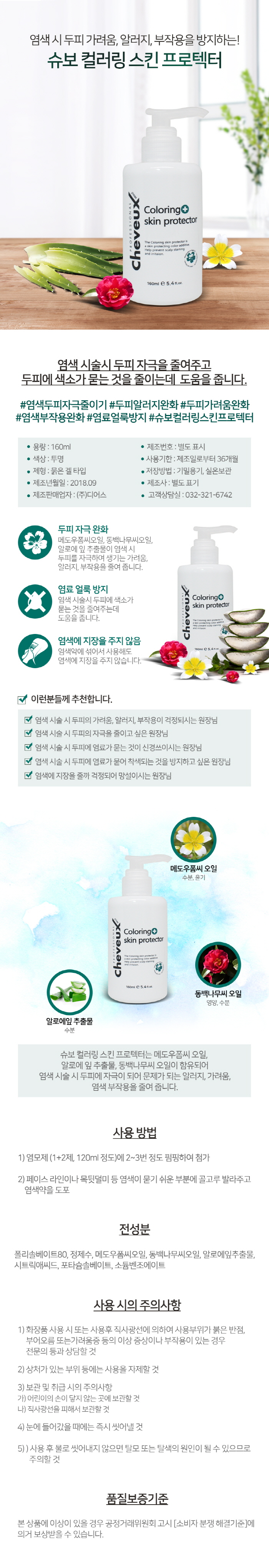 | [제품의특징] ■ 슈보 컬러링 스킨 프로텍터는 염색 시술시 두피 자극, 두피 트러블, 두피 가려움증 등의 염색 트러블을 줄여주어 좀 더 편안하게 염색을 할 수 있도록 도움을 줍니다. ■ 새치카바 염색시 가장 골칫거리인 페이스라인과 목 뒷덜미에 염색약의 색소가 침착되지 않도록 해주어 염색 후에 깨끗한 피부관리를 하는데 도움을 줍니다. ■ 또한 염색을 하면서 염색에 전혀 지장을 주지 않는 신개념 염색 두피 보호제입니다. * 모든 염색 알러지를 100% 예방하지는 않습니다. 염색 알러지, 두피 트러블을 줄여줍니다. |