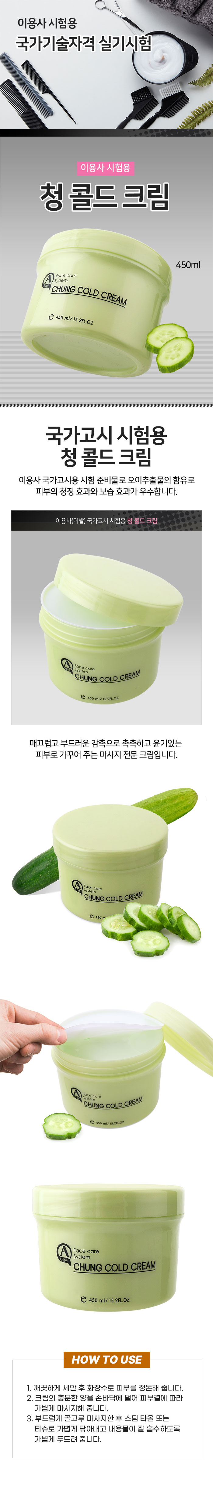 | 제품의 특징 - 국가고시 시험용 청 콜드 크림 - 오이추출물의 함유로 피부의 청정효과와 보습효과가 우수합니다. - 매끄럽고 부드러운 감촉으로 촉촉하고 윤기있는 피부로 가꾸어 주는 마사지 전문 제품입니다. |