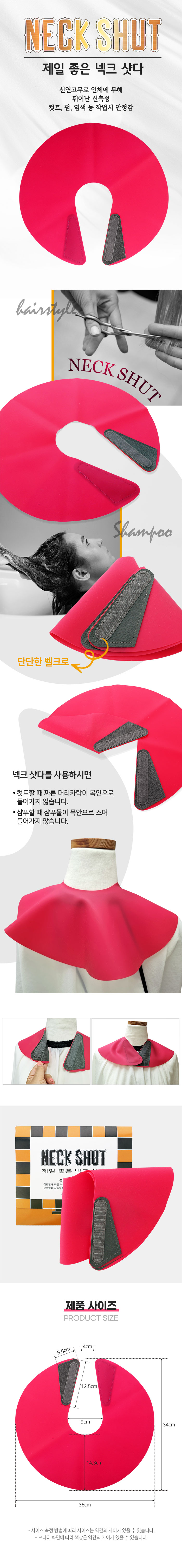 | 제품의 특징 - 천연고무로 인체에 무해하고 뛰어난 신축성 - 컷트, 펌, 염색, 등 작업시 안정감 - 컷트할때 짜른 머리카락이 목안으로 들어가지 않습니다. - 샴푸할때 샴푸물이 목안으로 스며들지 않습니다. |