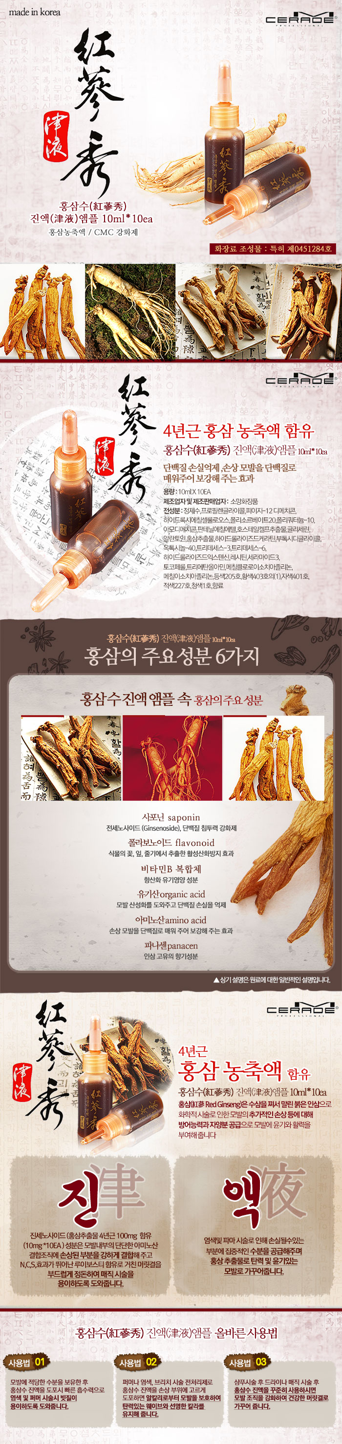 | 사용방법 - 모발에 적당한 수분을 보유한 후 홍삼수 진액을 도포시 빠른 흡수력으로 염색 및 퍼머 시술시 빗질이 용이하도록 도와줍니다. - 퍼머나 염색 브리치 시술 전처리제로 홍삼수 진액을 손상 부위에 고르게 도포하면 알칼리로부터 모발을 보호하여 탄력있는 웨이브와 선명한 칼라를 유지해 줍니다. - 샴푸시술 후 드라이나 매직 시술 후 홍삼수 진액을 꾸준히 사용하시면 모발 조직을 강화하여 건강한 머릿결로 가꾸어 줍니다. |