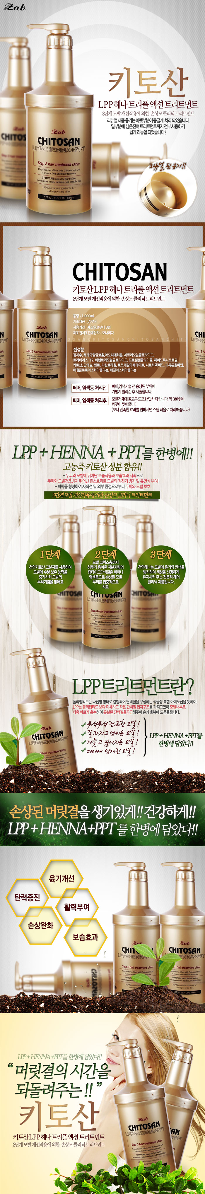| 제품의 특징 3단계 모발개선 작용에 의한 손상모 클리닉 트리트먼트 - 1단계 : 천연 키토산 고분자를 사용하여 모발에 수분 보유 능력을 증가시켜 모발의 부석거림을 없애줍니다. - 2단계 : 모발 코텍스층까지 침투가 용이한 저분자량의 펩타이드 단백질(LPP)은 퍼머나 염색 등으로 손상된 모발 부위를 집중적으로 치료합니다. - 3단계 : 천연헤나는 모발에 윤기와 변색을 방지하여 색상을 선명하게 유지시켜 주는 전문적 헤어클리닉 제품입니다. |