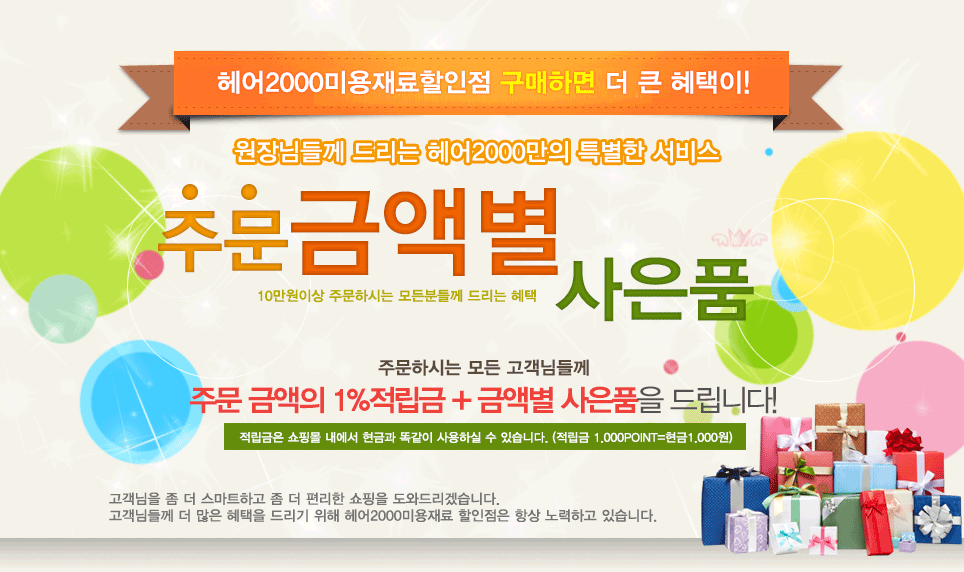 헤어2000에서는 10만원 이상 구매하신 원장님들께 주문금액에 따라 소정의 사은품 및 소모품 등을 드리고 있습니다.감사합니다.