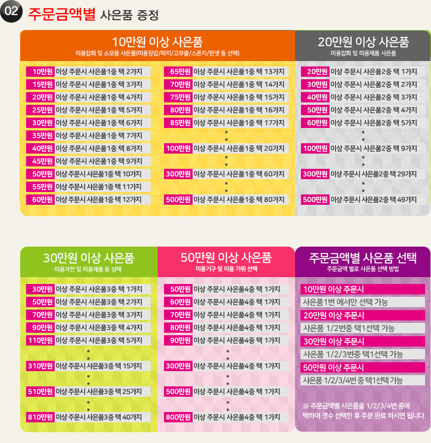 주문금액별 사은품 예외 품목 미용의자,샴푸대,미용카트,셋팅기구,디지털기계,열기구,바리깡,드라이기,일부 박스단위 특가